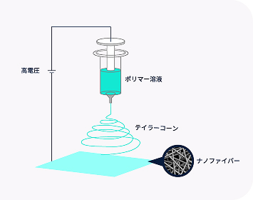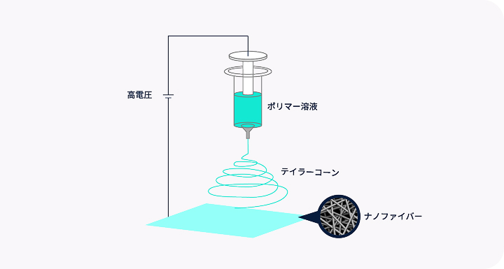 ナノファイバーの一般的な製造方法として、エレクトロスピニング法が挙げられます。この方法は、高電圧を利用してポリマー溶液やポリマーメルト(加熱して溶かしたポリマー)からナノファイバーを作り出す技術です。