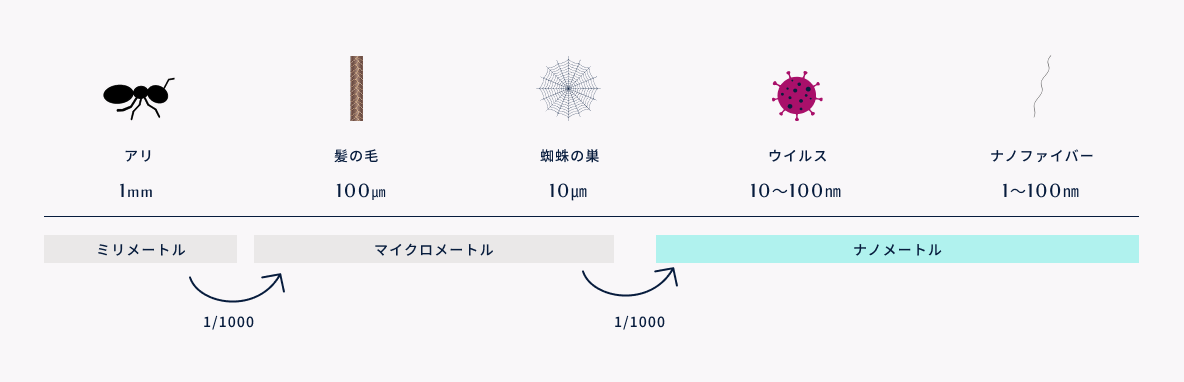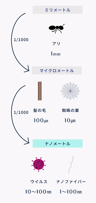 1ナノメートルは1メートルの10億分の1であり、髪の毛の太さの数万分の1に相当します。